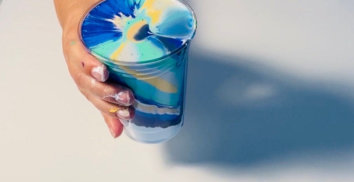 I layered my cup with different shades of blue, white, and a touch of gold and yellow. With this pouring medium, the colors stayed in their own separate layers and it was only after letting the cup rest for a few minutes that I saw any of the colors bleeding into each other. I did not need to adjust the consistency at all with any other additives or water. It did not have a strong odor and it was very easy to pour on the canvas.