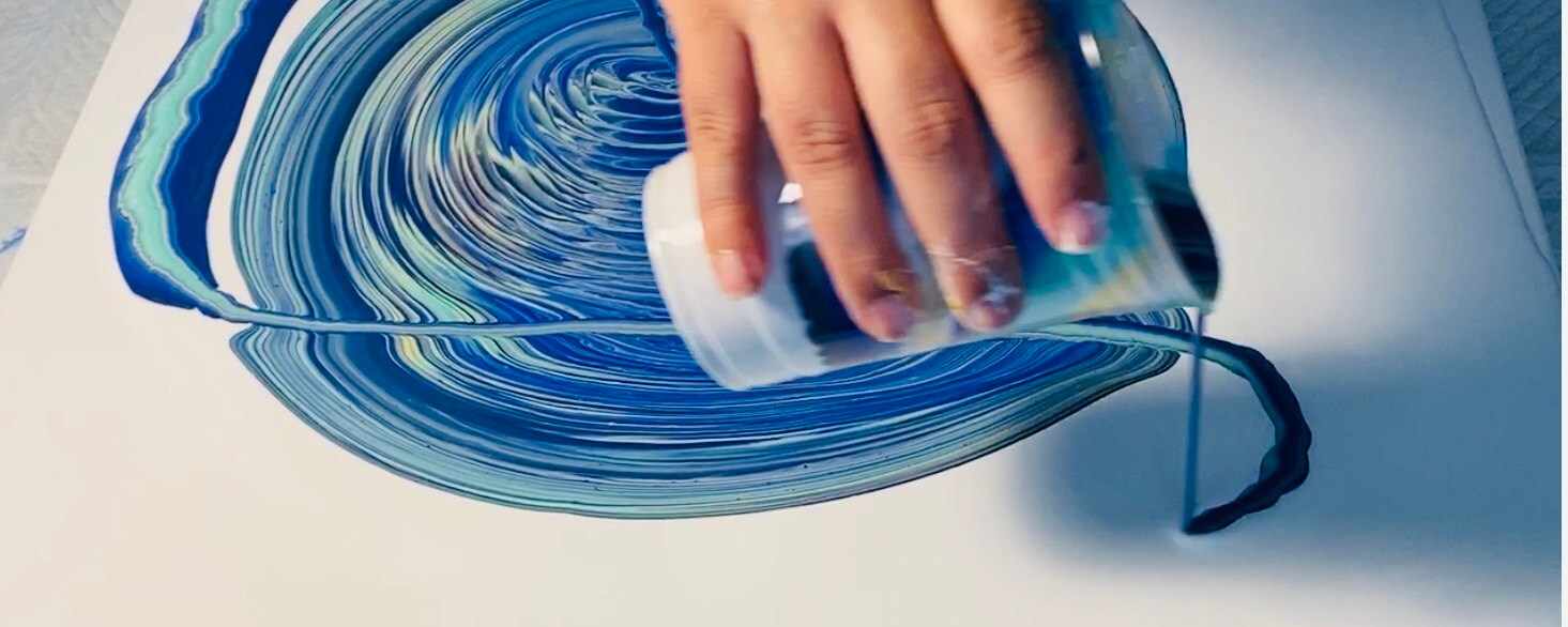 For most of my own paint pouring creations, I prefer a consistency that is similar to melted ice cream- creamy with a bit of thickness. When the paints are thick enough to hold a stir stick upright in my paint cup for a second, I know that they are not going to blend together too easily. With this type of consistency, I know that color bands will stay separate and if any structures are created in the composition, they won't just bleed away into the surrounding paint.